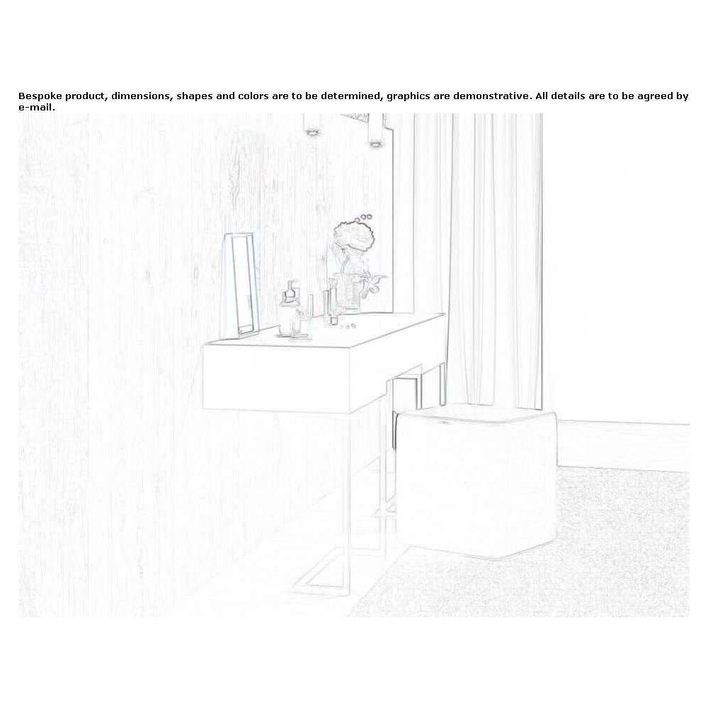 Konsola Gala z błyszczącego lakieru Grigio Antracite na metalowej konstrukcji w kolorze szarego karbonu. Jednostka centralna składa się z podnoszonej pokrywy z lustrem i oświetleniem LED, wnętrza pokrytego melaminą w kolorze szarej skóry i matowego lakieru Grigio Antracite. Konsola może być wyposażona w organizery ze sztucznej skóry Moka lub Bianco Toffee.