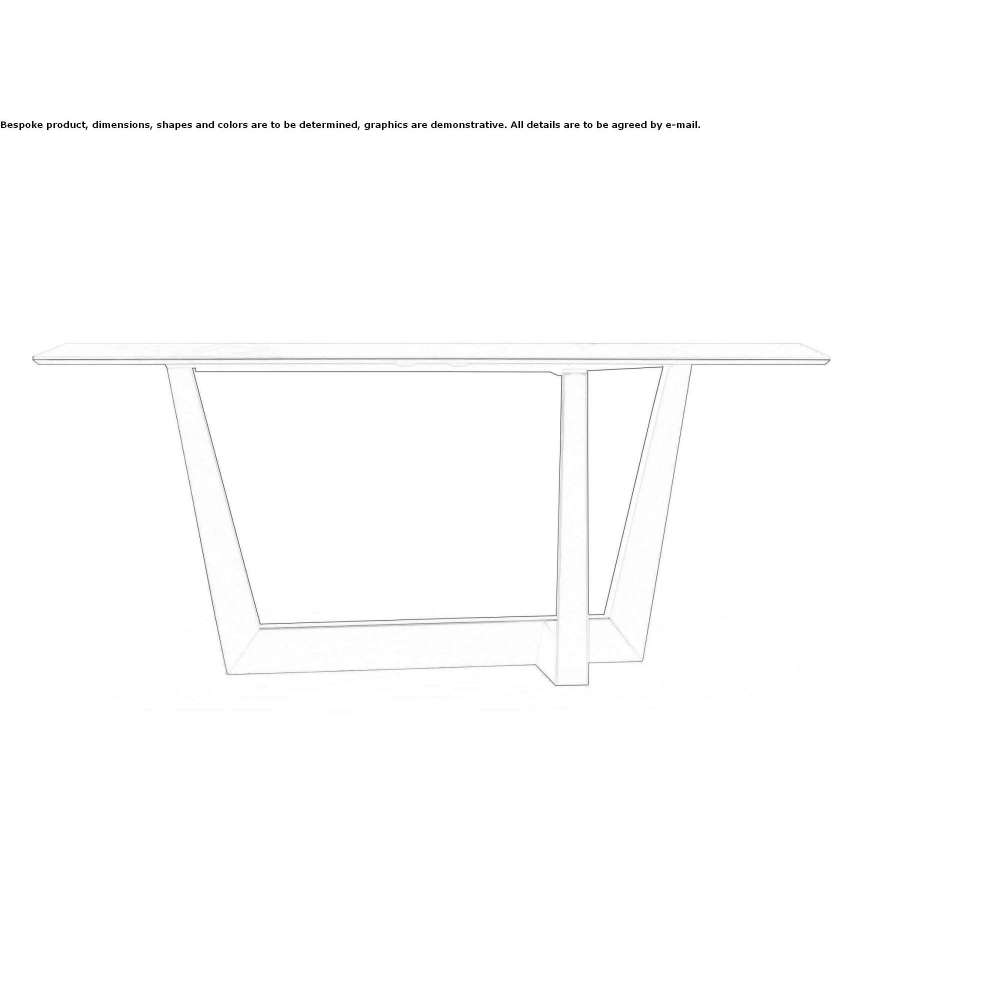 konsoli Art metalowy trapez rozwija się ukośnie pod blatem, co minimalizuje przeszkody i optymalizuje przestrzeń. Aby zapewnić stabilność, trapez uzupełniono dwiema nogami, które można dostosować za pomocą wstawek w tym samym wykończeniu co blat. Tak zaprojektowana rama nośna wyróżnia się zwiększoną dynamiką, solidnością i efektem rzeźbiarskim. Blat jest na nim solidnie osadzony, co daje finalny efekt niesamowitej lekkości. Podstawa dostępna w matowym malowanym metalu lub w eleganckim wykończeniu polerowanym lub miedziano-brązowym; blat jest dostępny w różnych wersjach drewna lub ceramiki. Można go dopasować do stołu o tej samej nazwie, Art wyróżnia się wyrafinowaną wartością geometryczną i graficzną, wzmocnioną bogactwem materiałów i wykończeń.