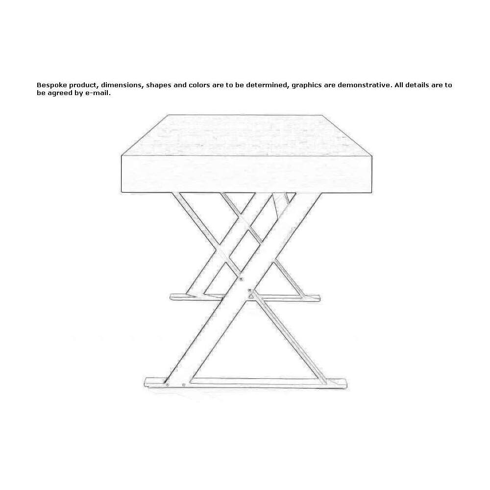 Typowe nogi w kształcie litery X z brązu, jasnego chromu, niklu lub stali malowanej na czarno do biurka z grubym blatem, który kryje praktyczne szuflady: biurko max jest dostępne w kolorze szczotkowanego jasnego lub czarnego dębu, szarego lub brązowego dębu.