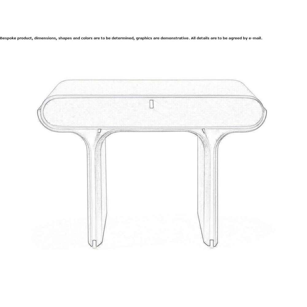 Szafka nocna z szufladą z zakrzywioną podstawą z jesionu barwionego na czarno z otwartymi porami i detalami z jasnego mosiądzu. Konstrukcja drewniana pokryta skórą lub zamszem według próbek.