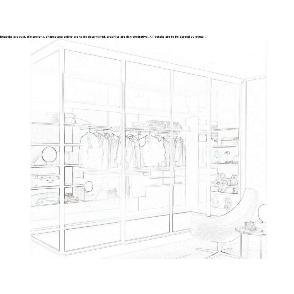 Elastyczna garderoba, panele cocò, akcesoria z orzecha włoskiego, polerowane wsporniki półek i drążki na wieszaki. System zamykania przesuwnego z przezroczystego, brązowego szkła i szczotkowana czarna rama.