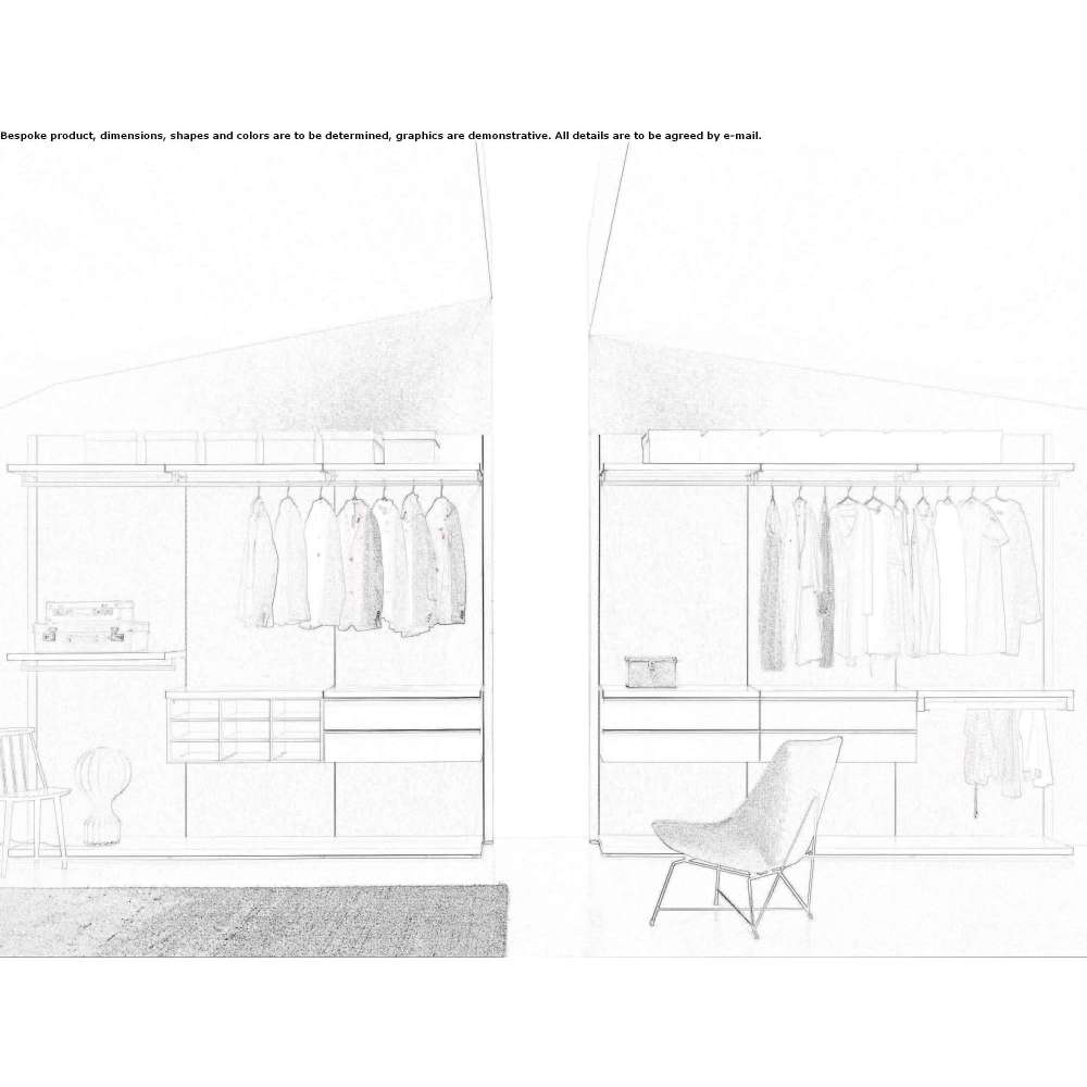 Panele ścienne wyposażone w pojemniki na meblościanki, drążki na wieszaki i półki: wszystko, czego potrzebujesz, aby stworzyć indywidualne rozwiązanie. Wykończenie tkaniny odwzorowuje wygląd prawdziwej tkaniny, w tonacji dopasowanej do powierzchni blatów i półek z neomatowego lakieru.