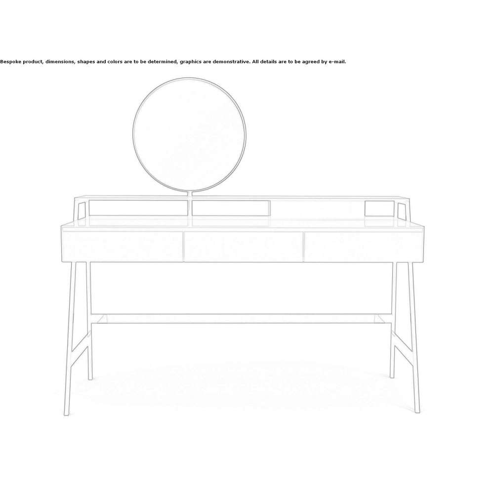 Venere to prawdziwa i kobieca próżność. Przykryte szkłem malowanym, według próbek w wersji jasnej lub satynowej. Regulowana średnica lustra podwójnego. 50cm. Kasztan z szufladami lakierowanymi z efektem dotyku „tkaniny”. Polerowana metalowa konstrukcja. Małe pudełka metalowe pokryte zamszem Sand 012.