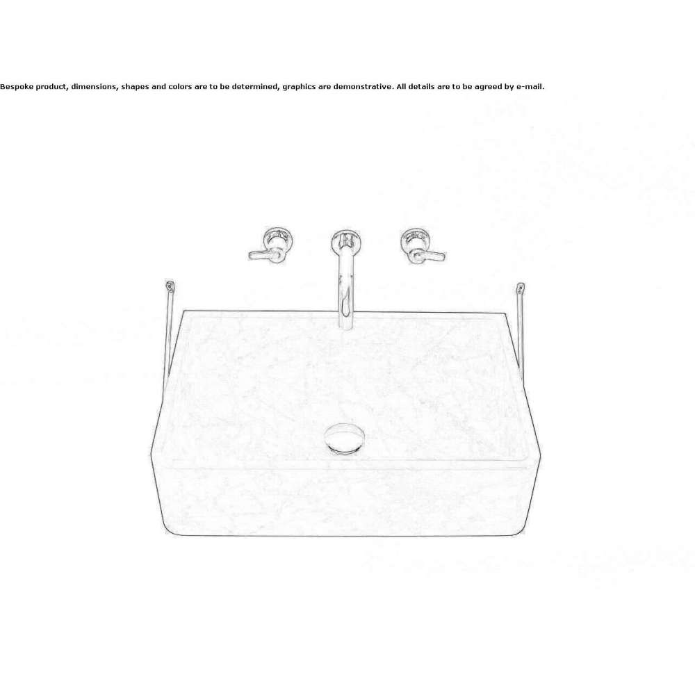 Prostokątna umywalka z białego marmuru z Carrary, szarego marmuru karnickiego, czarnego marmuru Marquina, zielonego marmuru Alpi lub ciemnego marmuru Emperador bez przelewu, bez otworu na baterię; wsparta na konstrukcji z polerowanej stali nierdzewnej.