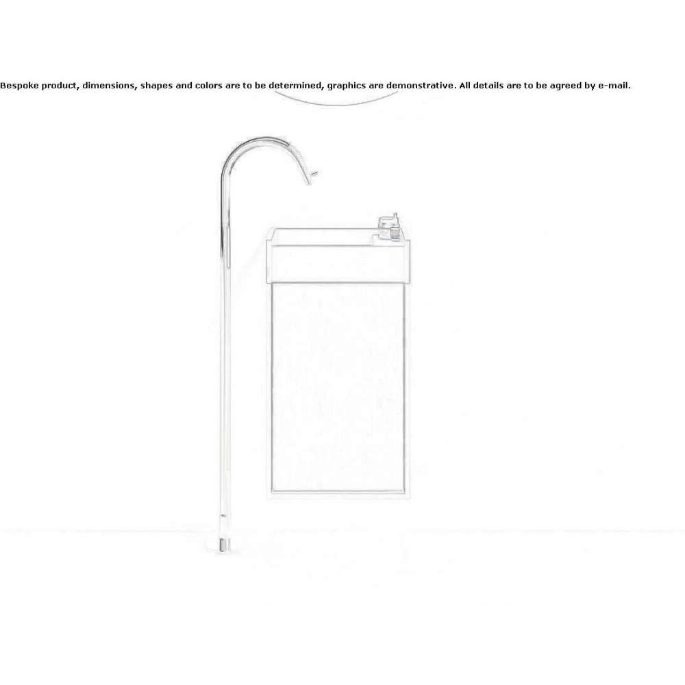 Minimalne wymiary i wyjątkowa elastyczność jak na obiekt modułowy w dwóch wariantach, oba grają w tych samych rozmiarach: 20 x 40 cm. W wersji prostopadłej, mocowanej do ściany wzdłuż krótszego boku, uzupełnieniem umywalki jest pojemnik z szufladą z dwiema półkami. Wersja równoległa do ściany, mocowana na dłuższym boku, zintegrowana jest z pojemnikiem z drzwiami uchylnymi i dwiema półkami lub koszem na ręczniki zamykanym drzwiami klapowymi. Umywalka wykonana jest z betonu w różnych wykończeniach, natomiast pojemnik jest dostępny w dwóch różnych materiałach: drewno w fornirze wielowarstwowym w wykończeniu dębowym lub tekowym lub szczotkowana stal nierdzewna, odpowiednia również do użytku na zewnątrz. W serii dostępna jest również wersja z uchwytem na wąż ogrodowy wewnątrz pojemnika.