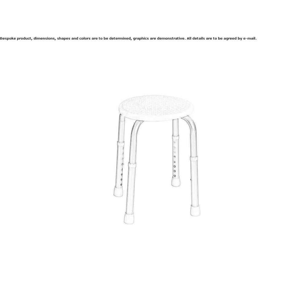 Zaokrąglony stołek łazienkowy z możliwością regulacji wysokości. Rama aluminiowa, wstawki polipropylenowe.