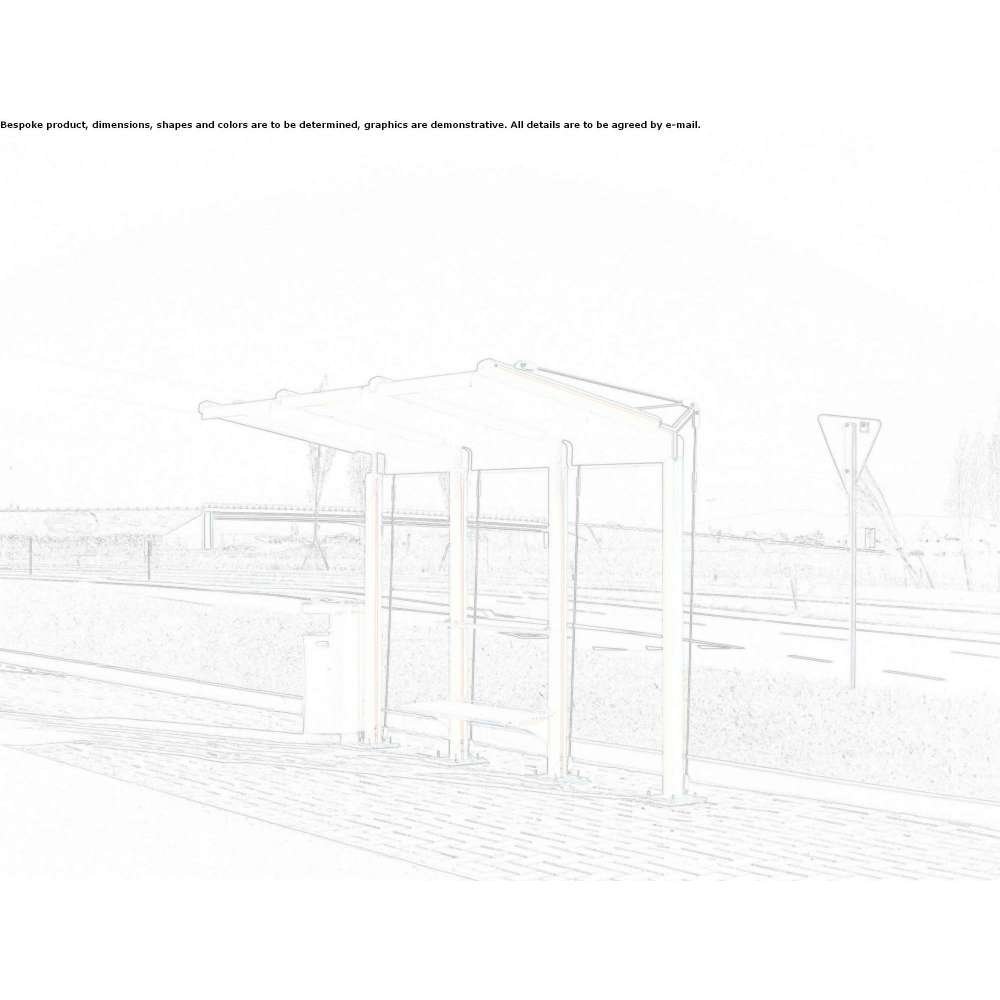 Modułowa jednostronna wiata autobusowa z aluminium malowanego proszkowo i stali nierdzewnej z pokrywą z aluminiowego panelu kompozytowego ze szklanymi ścianami tylnymi i bocznymi. Wiata autobusowa może być wyposażona w oświetlenie taśmowe LED, szklaną ścianę boczną, aluminiowy wyświetlacz A3 z zatrzaskiem oraz ławkę ocynkowaną i malowaną proszkowo.