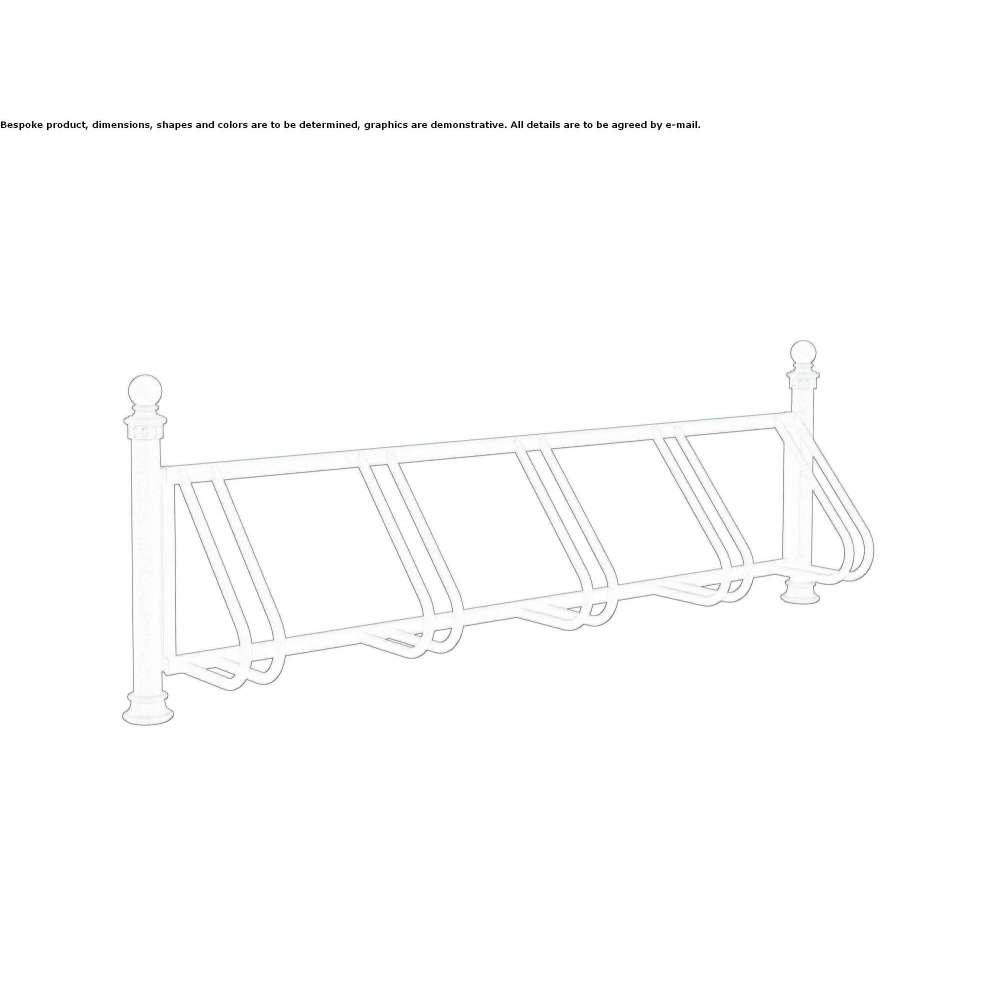 Bagażnik na pięć rowerów (lub dwustronny na 10 rowerów). Zaprojektowany z myślą o centrach starych miast. Wykonany z rury mm 40x20, elementy do parkowania rowerów w okrągłej rurze Ø mm 25. Dostarczany z dwoma bocznymi słupkami Ø mm 60, z ozdobnymi kulami na górze i kołnierzami do mocowania do podłoża. Cynkowane ogniowo i malowane proszkowo w temperaturze 180°. Szerokość cm 200.